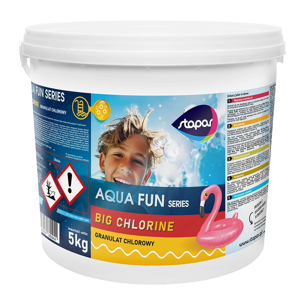 AQUA FUN Granulat chlorowy to skuteczny środek do dezynfekcji wody basenowej. Dzięki swojej szybkiej rozpuszczalności, szybko eliminuje bakterie, wirusy i glony, zapewniając czystą i bezpieczną wodę do kąpieli. Jest łatwy w użyciu i doskonale sprawdza się zarówno w basenach odkrytych, jak i krytych. Idealny dla osób poszukujących skutecznej ochrony przed zanieczyszczeniami w basenie.
