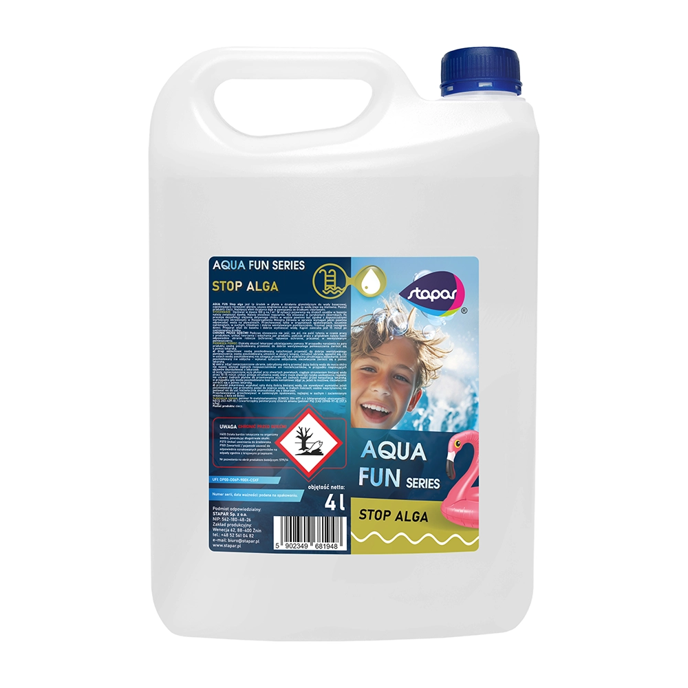 AQUA FUN Stop alga to skuteczny środek zapobiegający rozwojowi glonów w basenie. Dzięki swojej specjalnej formule, hamuje wzrost glonów, zapobiegając powstawaniu zielonego nalotu na ścianach i dnie basenu. Jest łatwy w użyciu i zapewnia długotrwałą ochronę przed problemami związanych z glonami.