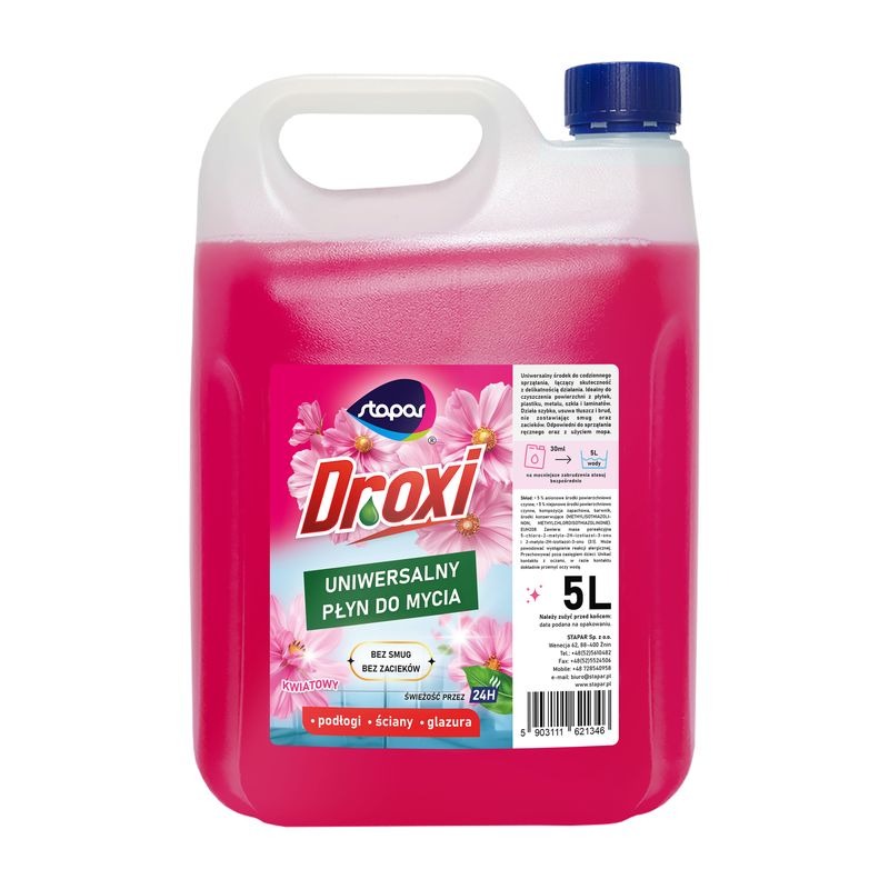 Uniwersalny płyn do mycia KWIATOWY Dr Oxi to niezawodny środek czyszczący, idealny do codziennego użytku w całym domu. Jego skuteczna formuła łatwo usuwa kurz, brud oraz tłuste plamy z różnych powierzchni, takich jak podłogi, kafelki, blaty kuchenne czy meble. Płyn nie tylko zapewnia doskonałe efekty czyszczenia, ale także wypełnia pomieszczenia świeżym, kwiatowym aromatem, który utrzymuje się przez długi czas. Produkt jest łatwy w użyciu – wystarczy dodać odpowiednią ilość do wody i przetrzeć wybraną powierzchnię. Dzięki swojej delikatnej formule, płyn jest bezpieczny dla większości materiałów, nie powodując ich uszkodzeń ani odbarwień. Regularne stosowanie płynu uniwersalnego o zapachu kwiatowym zapewnia czystość i świeżość w Twoim domu, tworząc przyjemną atmosferę w każdym pomieszczeniu.